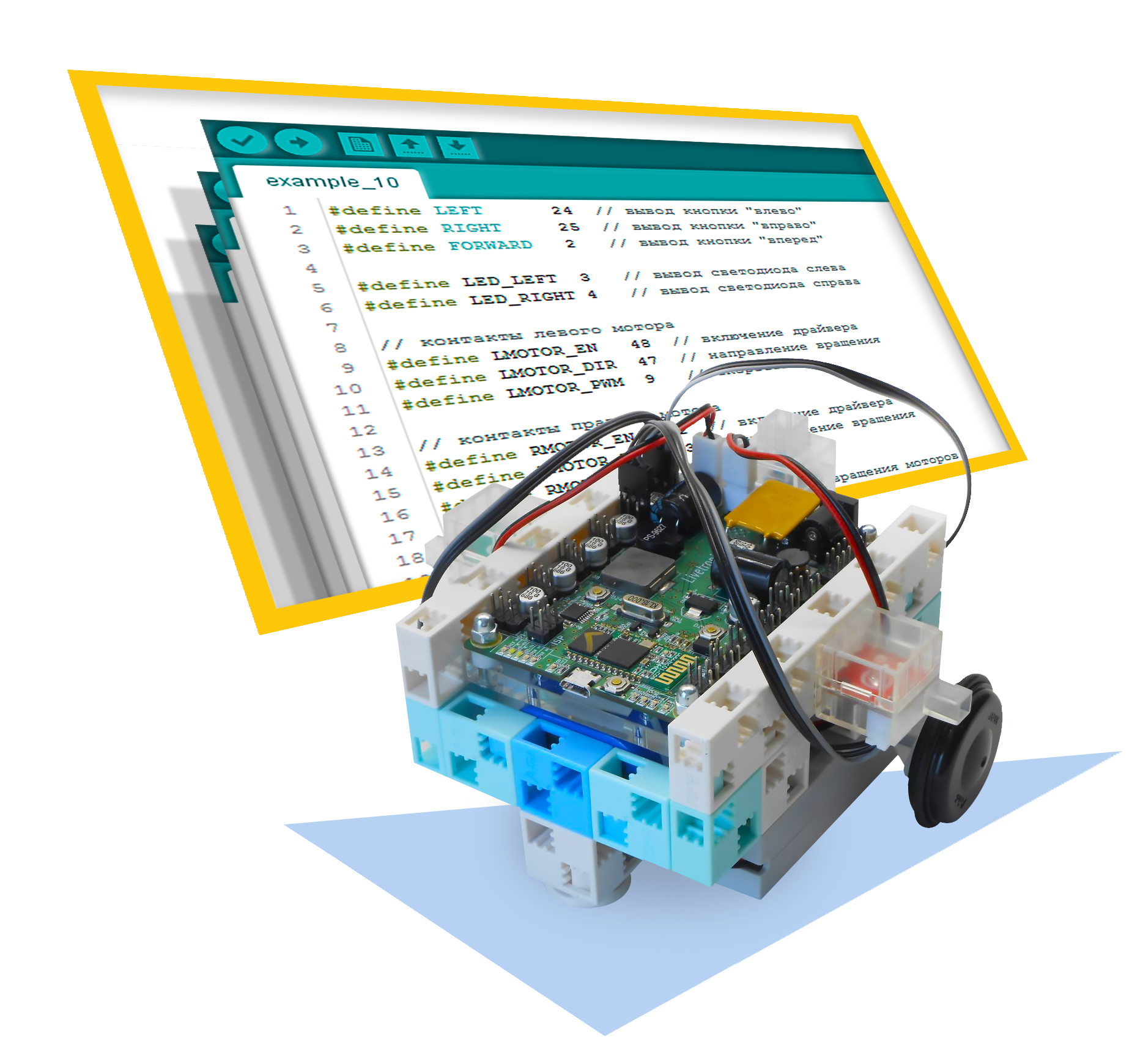 В программу также входит изучение принципов работы электронных приборов (цифровые и аналоговые сигналы, ШИМ, протоколы связи), устройств (светодиоды, кнопки, датчики, моторы, устройства индикации) и алгоритмов (обработка сигналов, регуляторы), используемых в робототехнике и системах с обратной связью.