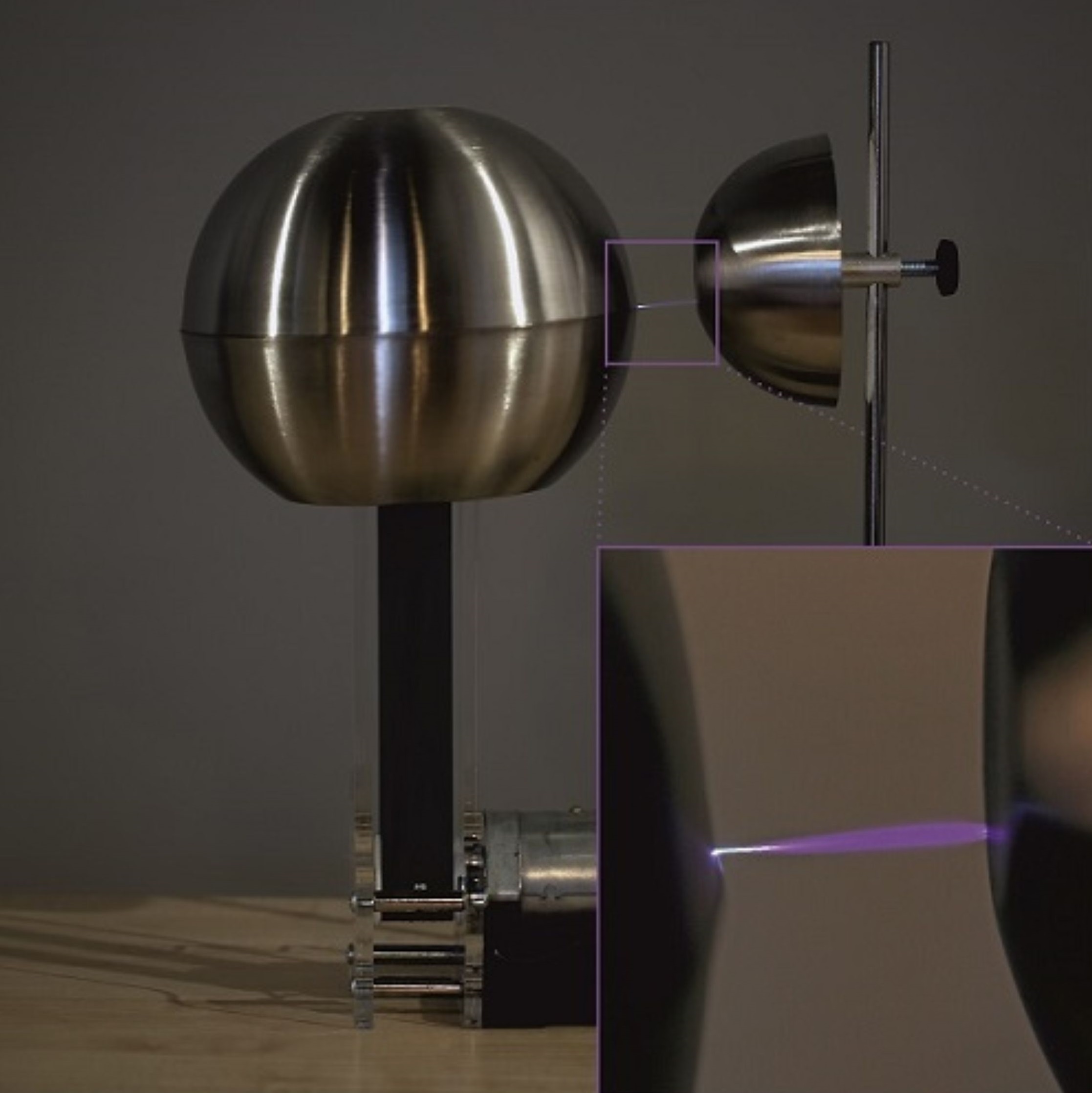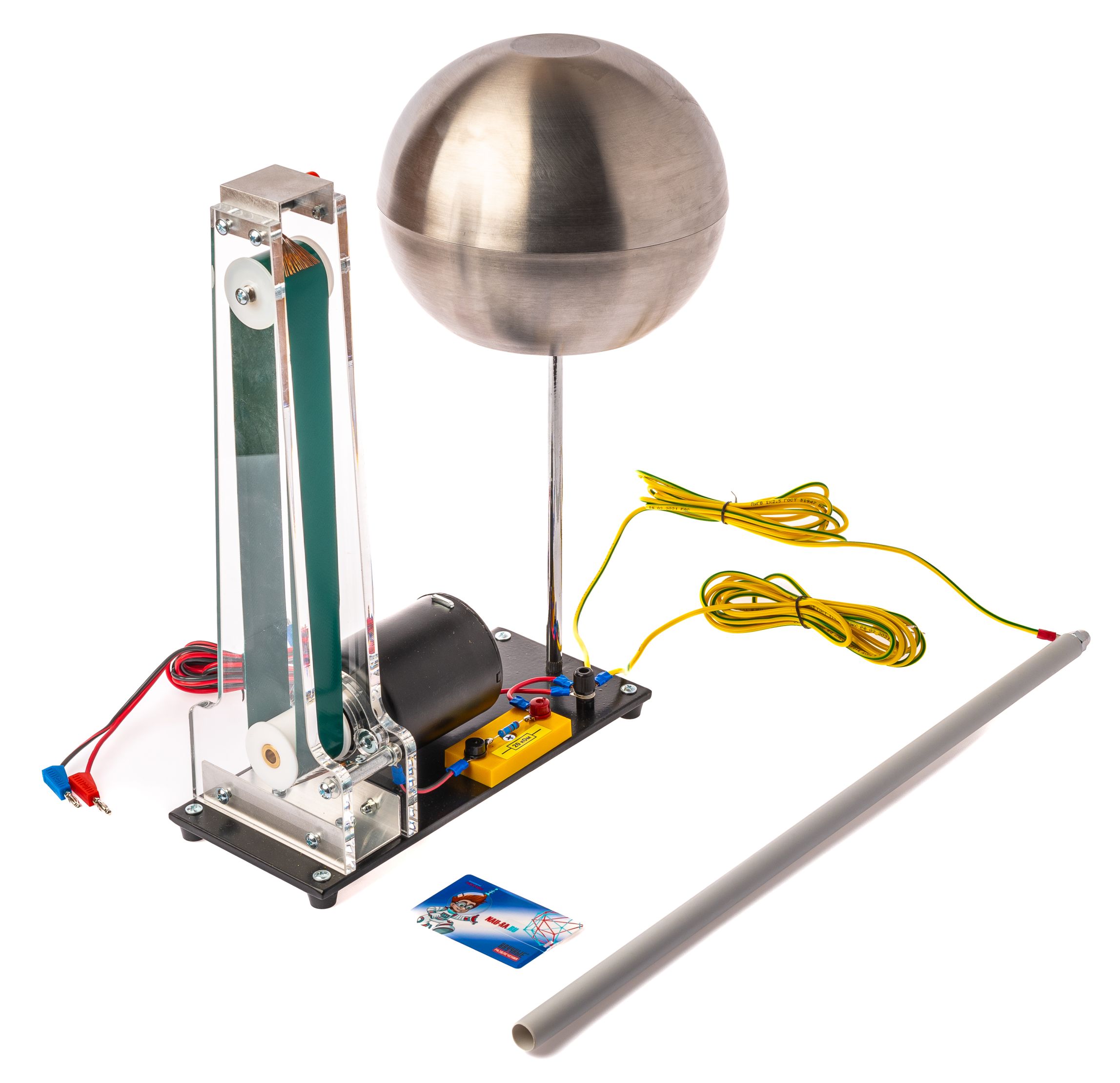 Конструкция: основание, полая металлическая сфера (заряжаемая до напряжения), привод с прорезиненной лентой, щётки для передачи заряда, разрядное устройство, резистор для измерения тока зарядки.