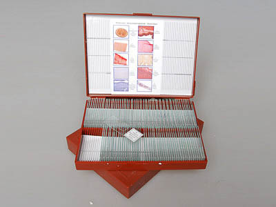 Комплектность: поперечный срез спинного мозга (нервные клетки) - 15 шт., ткани желудка - 5 шт., кровь человека - 15 шт., однослойный эпителий - 15 шт., гиалиновый хрящ - 15 шт., костная ткань - 5 шт., сперматозоиды человека - 15 шт., гладкая мышечная ткань - 15 шт., поперечно-полосатая мышечная ткань - 5 шт., кровеносные сосуды - 5 шт. Всего: 110 шт.