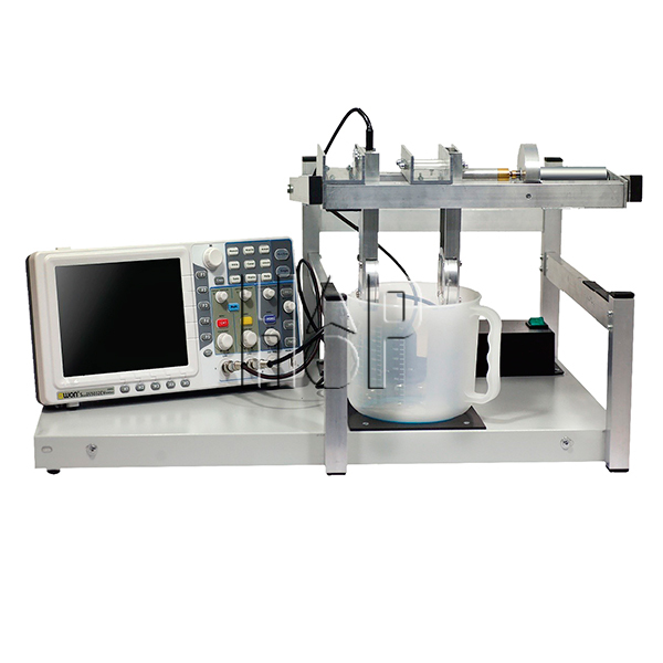 Лабораторная установка смонтирована в виде настольного металлического стенда и включает в себя сборку акустического резонатора, резервуар для жидкости, генератор с блоком питания и осциллограф. Конструкция установки обеспечивает контролируемое изменение длины акустического резонатора за счет перемещения одного из отражателей. Питание излучателя осуществляется от генератора синусоидального сигнала. В состав установки входит цифровой двухканальный запоминающий осциллограф с функциями вывода на экран амплитуды сигналов и частоты в цифровом виде.